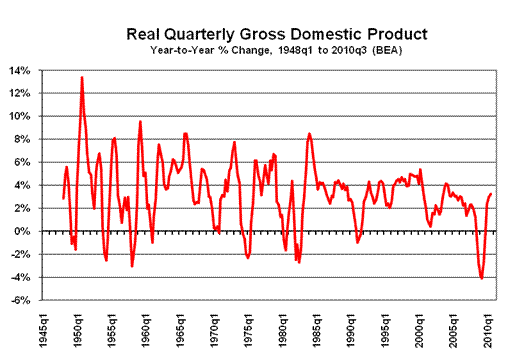 GDP — The Detail. Published yesterday, December 22nd, by the Bureau of Economic Analysis (BEA), the "third" estimate or second revision of third-quarter 2010 Gross Domestic Product (GDP) showed a revised but still statistically-insignificant annualized real growth rate of 2.56% (previously 2.53%, initially 2.01%) +/- 3% (95% confidence interval), up from an estimated 1.72% in the second-quarter. The year-to-year change in real third-quarter GDP revised to 3.25% (previously 3.24%, initially 3.11%), up from 3.00% in the second quarter.