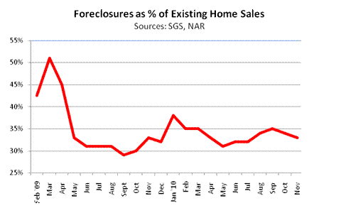 Foreclosure activity remained a major distorting factor for home sales, with "distressed" activity accounting for an estimated 33% of existing sales in the NAR’s November reporting, down from an estimated 34% in October. Short-lived foreclosure moratoriums likely are having some impact here.