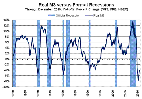 Systemic Risk. If the U.S. financial system were healthy and no longer at risk of collapse, banks would be lending increasing amounts of money into the normal stream of commerce, the money supply would be growing, and the Fed would not be monetizing federal debt. Instead, despite the Fed pumping extraordinary amounts of cash into the system, bank lending for consumer credit and commercial and industrial loans still is contracting month-to-month and year-to-year, due at least partially to impaired balance sheets at a number of banks. Broad money supply, as measured by the SGS-Ongoing M3 estimate has been contracting year-to-year for more than a year, and while the monthly change had flattened out and started moving higher in May 2010, November and an early approximation on December levels suggest a resumption of month-to-month decline. Early December reporting suggests that all three money supply measures displayed below (through November 2010) will show weaker or more-negative patterns of year-to-year change in December than they did in November. These factors are symptomatic of ongoing systemic solvency issues.