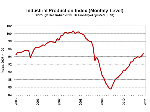 As to the specific production data, the Federal Reserve Board reported today (January 14th) that seasonally-adjusted December 2010 industrial production rose by 0.84% (1.04% before revisions to November’s initial reporting, which were in the context of revisions to a number of prior months). November’s revised production showed a revised 0.26% (previously a 0.42%) gain.