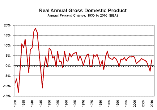 The following graphs show, first, year-to-year percent change in the official inflation-adjusted quarterly GDP for the history of the series. The record annual contraction for the series was 4.11%, seen in second-quarter 2009. The second graph shows the average annual real growth by year for the history of the series. The record annual contraction there, following the World War II production shutdown, was 2.63% in 2009.