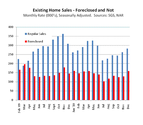 Foreclosure activity remained a major distorting factor for home sales, with "distressed" activity accounting for an estimated 36% of existing sales in the NAR’s December reporting, up sharply from 33% in November. Short-lived foreclosure moratoriums still likely are having some impact here.