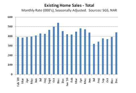 The preceding graphs reflect different measures of home sales activity since February 2009. The updated numbers, through December 2010, reflect the seasonally-adjusted level of monthly sales, rather than the annual rates usually published by the industry.