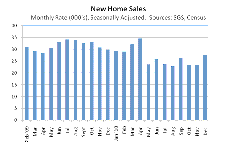 December Home Sales Reflected Increasing Numbers of Foreclosures. Both existing and new home sales continued a pattern of bottom-bouncing. Wednesday’s (January 26th) reporting of December new-home sales (counted based on contract signings, Census Bureau) showed a statistically-insignificant monthly gain of 17.5% (up 13.4% before prior period revisions) +/- 20.7% (95% confidence interval) from November. November’s revised level was unchanged from October, where it previously had been a 5.5% monthly decline. The year-to-year decline in the new home sales series in December 2010 was a statistically-insignificant 7.6% +/- 19.9% (95% confidence interval), versus a revised 23.9% (previously 21.2%) decline in November.