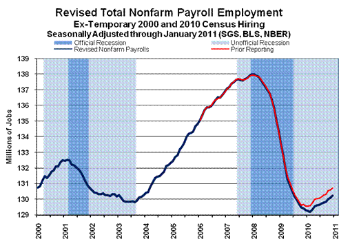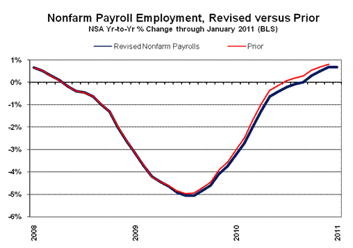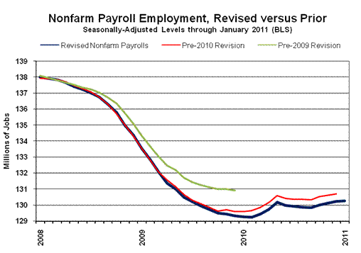 In last month’s release, the BLS proclaimed, "Since December 2009, total payroll employment has increased by 1.1 million, or an average of 94,000 per month." As a result of the revisions, the previous payroll trough of December 2009 now has been replaced by February 2010, and the gain in payrolls from December 2009 to December 2010 eased back to 909,000.