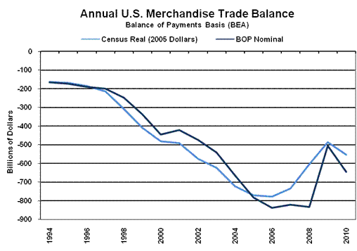 On an annual basis the real trade deficit in goods (the services components is largely a guess, with little hard data behind it, so the BEA does not publish hard estimates of its surplus adjusted for inflation) in 2010 was $555.3 billion (2005 chain-weighted dollars) versus $486.6 billion in 2009, again reflecting stronger import than export growth. The deficit in 2008 was $604.0 billion.