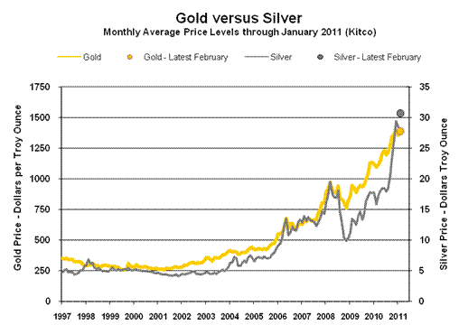 Gold and Silver Highs Adjusted for CPI-U/SGS Inflation. Despite November 9th’s historic high gold price of $1,421.00 per troy ounce (London afternoon fix) and the multi-decade high silver price of $30.77 per troy ounce (London fix) yesterday (February 16th), gold and silver prices have yet to approach their historic high levels, adjusted for inflation. The earlier all-time high of $850.00 (London afternoon fix, per Kitco.com) of January 21, 1980 would be $2,406 per troy ounce, based on January 2011 CPI-U-adjusted dollars, $8,047 per troy ounce based on SGS-Alternate-CPI-adjusted dollars (all series not seasonally adjusted).