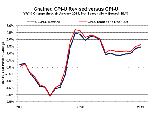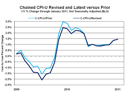 C-CPI-U year-to-year inflation increased to 1.45% in January 2011, versus an unrevised 1.35% in December 2010.