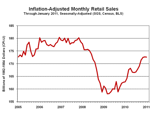 Real Retail Sales. Based on the January 2011 CPI-U reporting, inflation- and seasonally-adjusted monthly January 2011 retail sales declined by 0.06%, where, before inflation adjustment, the current number was up by 0.34%. Real December sales notched higher by 0.09% in revision, revised from a prior 0.1% contraction thanks to the seasonal-factor revisions in the CPI-U. See Commentary No. 351 for other January 2011 retail sales detail.
