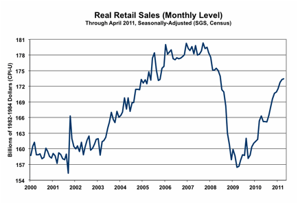 Version II: April 2011 versus March 2011 seasonally-adjusted retail sales—net of the monthly change in revenues for grocery stores and gas stations—was unchanged (up by 0.02%) versus the aggregate gain of 0.5%.