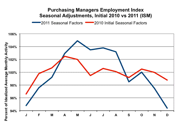 The extreme shifts seen in the employment-component seasonal factors for the purchasing managers manufacturing survey between 2010 and 2011 were not stable, as shown in the above graph. Where the factor is divided into the number to be adjusted, the higher the adjustment is, the lower will be the adjusted number. Hence, the relatively high seasonal-adjustment factor for May 2011 partially was responsible for the size of the downside swing from the seasonally-adjusted April (62.7, unadjusted 64.5) employment component to the May (58.2, unadjusted 61.0) component, catching up from earlier overstatement in the series. Where this series is revised annually, neither the 2011 nor the 2010 seasonal adjustments are or were stable and meaningful, with result that widely followed month-to-month comparisons simply are unreliable, effectively useless, at present.