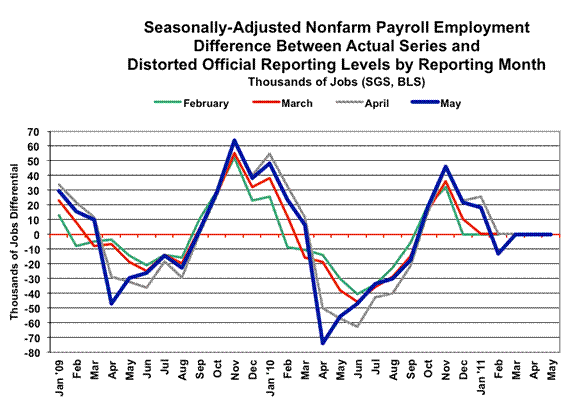 Birth-Death/Bias Factor Adjustment. Despite the ongoing and regular overstatement of monthly payroll employment—as evidenced by the regular and massive, annual downward benchmark revisions to the reported payroll numbers—the BLS keeps upping its monthly biases in post-benchmark reporting. For May 2011, there was a positive monthly bias used of 206,000 jobs, up from the revised estimate of 192,000 used in May 2010. In April, the net bias was a boost of 175,000 jobs. These upside biases reflect an ongoing assumption of a net positive jobs creation by new companies versus those going out business. Such becomes a self-fulfilling system, as the upside biases boost financial-market and political needs with relatively good headline data, while also setting up the next year’s downside benchmark revisions, which traditionally are ignored by the media and the politicians.