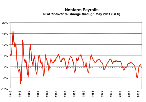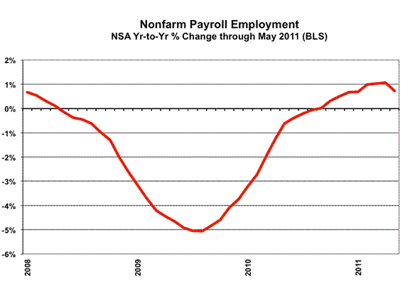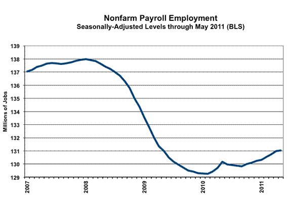 Payroll Survey Detail. The Bureau of Labor Statistics (BLS) reported a statistically-insignificant, seasonally-adjusted May 2011 jobs gain of 54,000 (an increase of 15,000 jobs before prior-period revisions) +/- 129,000 (95% confidence interval). April payrolls showed a revised 232,000 (previously 244,000) gain. Yet, as discussed earlier, some of the softening in growth was due to minor catch up in the ongoing statistical distortions from the monthly recasting of seasonal adjustment factors, which shift seasonally-adjusted jobs from earlier months, but where the BLS does not publish the earlier revisions. It is not so much that jobs growth suddenly is slowing, it is that previously reported jobs growth never was as advertised.