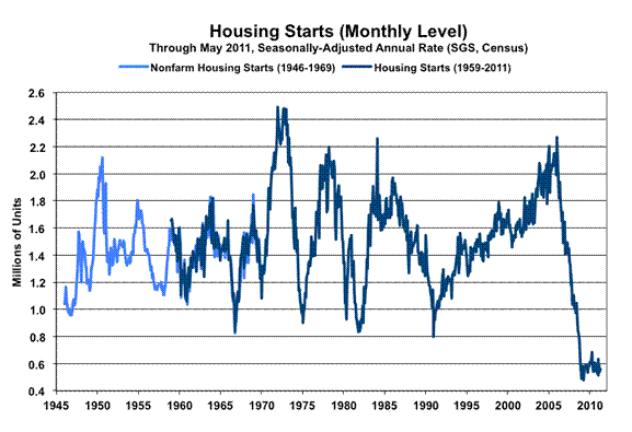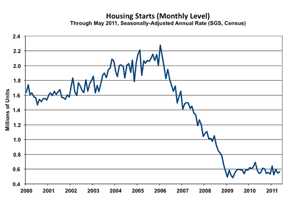 May Gain Was Statistically Meaningless. The regularly volatile housing starts series continued its pattern of weakening bottom-bouncing in May, albeit with a small monthly uptick, but with no indications of a reprieve for the housing industry or the otherwise deteriorating broader economy. The Census Bureau reported this morning, June 16th, a statistically-insignificant monthly increase in seasonally-adjusted May 2011 housing starts of 3.5% +/- 14.5% (95% confidence interval); the gain was 7.1% before prior-period revisions. April starts were revised to an 8.8% (previously 10.6%) monthly decline.