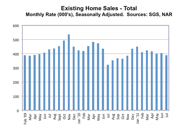 July New Home Sales Showed an Ongoing, Downtrending Bottom-Bounce. Consistent with the long-term negative trends in housing starts and existing home sales (See the prior Commentary No. 385 for July details), the August 23rd release of July new-home sales (counted based on contract signings, Census Bureau) showed an ongoing pattern of bottom-bouncing near historic lows, with a statistically-insignificant monthly decline of 0.7% (down 4.5% before prior-period revisions) +/- 15.1% (95% confidence interval) from June. In turn, June’s decline was revised to a 2.9% drop (previously down by 1.0%) versus May. The year-to-year gain in July 2011 new-home sales was a statistically-insignificant 6.8% +/- 14.7% (95% confidence interval). What previously had been reported as a 1.6% annual gain in June revised to a 2.3% annual contraction.