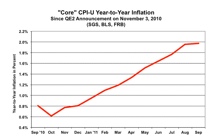 Although at slower pace of increase in September, the CPI-U’s annual “core” inflation rate has risen now for 11 straight months, since the Fed introduced QE2. As shown in the following graph, the annual core rate rose to 1.97% in September versus 1.95% in August, and was up from 0.61% in October 2010.
