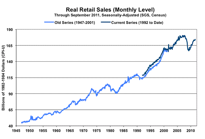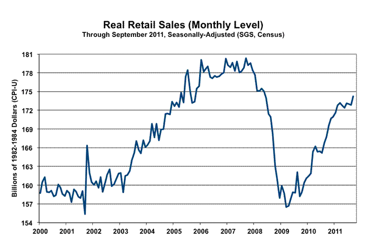 Real retail sales in third-quarter 2011 were up by a 0.34% from the second-quarter, which, in turn, was up by 0.14% from the first-quarter.
