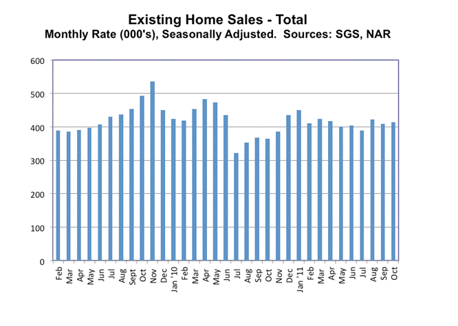 The small gain in October existing home sales was consistent with the ongoing general pattern of bottom-bouncing activity in the housing industry. The National Association of Realtors continued to indicate ongoing systemic difficulties for sales, in terms of credit availability and adequate appraisal levels, with significant closing-sales volume reflecting cash sales and/or distressed sales.