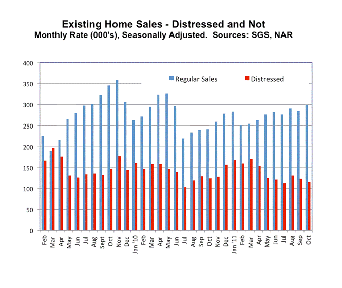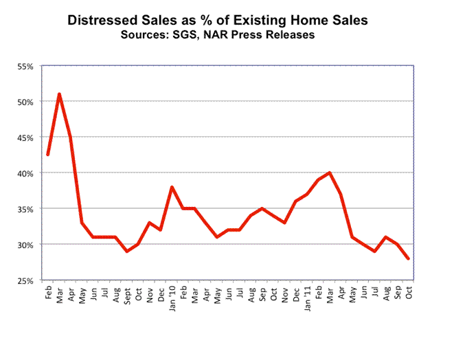 Foreclosure activity remained a major distorting factor for home sales, with "distressed" activity accounting for an estimated 28% of existing sales in the NAR’s October reporting, down from the 30% estimated in September. The NAR also has started to break out estimated distressed sales by foreclosures and short sales. In October, foreclosures accounted for an estimated 17% of total sales, versus 18% in September, while short sales were estimated at 11% in October, versus 12% in September.