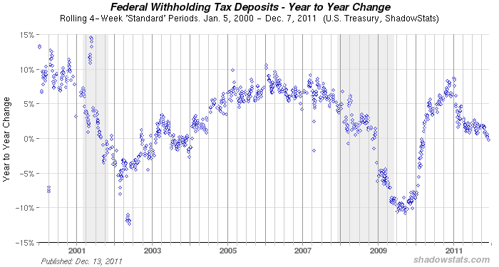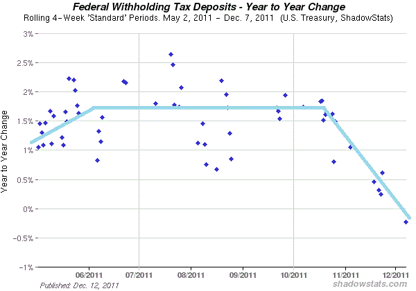 Withholding Puzzle: Downturn in Annual Change for Withholding Tax Receipts Runs Counter to BLS Earnings Reports. A sharp downturn in the annual change in withholding tax receipts by the U.S. Treasury is signaling a deterioration in personal income. The shift in tax revenues began to surface in Treasury reporting of October 2011 and has continued through the latest available numbers, as of December 7th.