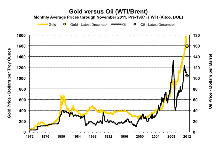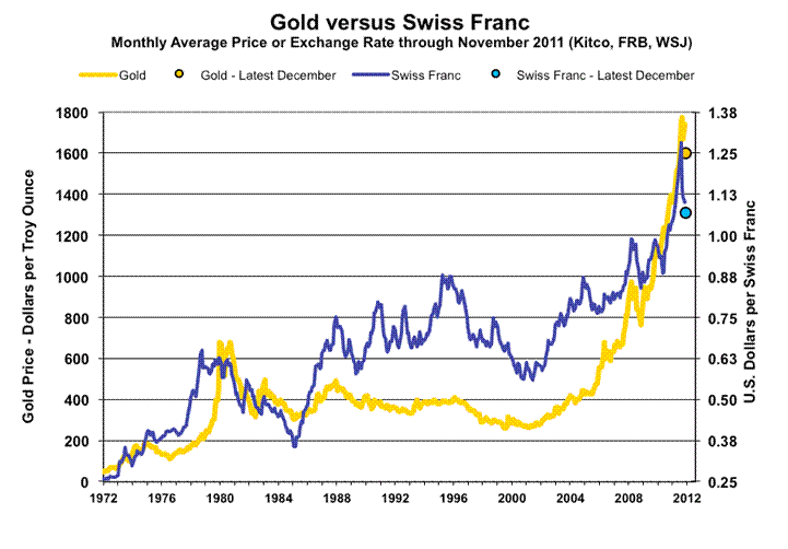 Following are the usual graphs of gold versus the Swiss franc, oil and silver. The volatility of the last week is indicated in the “Latest December” data points, which reflect the markets as this Commentary goes to press.