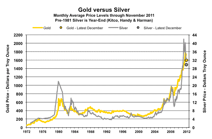In like manner, the all-time high price for silver in January 1980 of $49.45 per troy ounce (London afternoon fix, per silverinstitute.org), although approached earlier this year, still has not been hit since 1980, including in terms of inflation-adjusted dollars. Based on November 2011 CPI-U inflation, the 1980 silver price peak would be $144 per troy ounce and would be $506 per troy ounce in terms of SGS-Alternate-CPI-adjusted dollars (again, all series not seasonally adjusted).