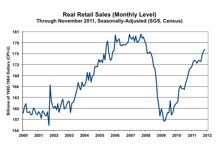 Real (Inflation-Adjusted) Retail Sales. Based on the November 2011 CPI-U reporting, inflation- and seasonally-adjusted November 2011 retail sales rose by 0.24% for the month, where, before inflation-adjustment, the current number was up by 0.22% (see Commentary No. 406 for details of the nominal reporting). October real retail sales revised to a 0.70% (initially 0.62%) gain, where the nominal (not-adjusted-for-inflation) revised to a 0.61% (previously 0.54%) gain.