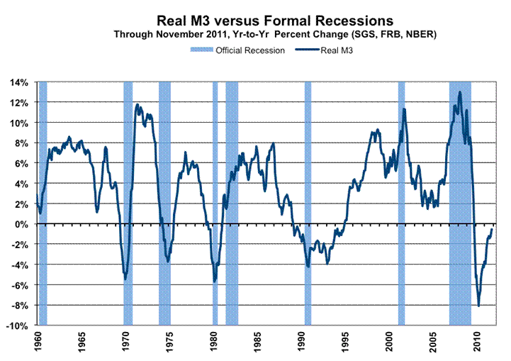 Real Money Supply M3. The signal of the unfolding double-dip recession, based on annual contraction in the real (inflation-adjusted) broad money supply (M3), discussed in the Hyperinflation Special Report (2011), continues and is reflected in the next graph. Based on the November CPI-U report and the latest November SGS-Ongoing M3 Estimate, the annual contraction in real M3 for November 2011 was 0.6%, narrower than the 0.9% annual contraction estimated for October. The smaller annual contraction in November was due to a combination of what still should prove to be a short-lived downside blip in the annual CPI-U inflation rate as well a small pick-up in annual M3 growth.