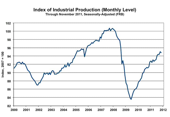 Industrial Production Dropped 0.2% in November. In the context of the usual six months worth of revisions, yesterday’s (December 15th) Federal Reserve Board release of seasonally-adjusted November 2011 industrial production showed a monthly decline of 0.22% (up 0.12% net of prior-period revisions) versus October. In turn, October showed a revised gain of 0.66% (previously 0.68%) versus September.