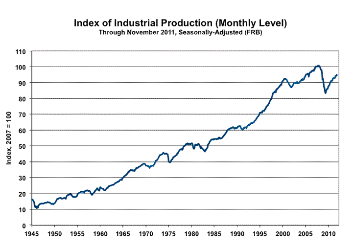 Officially, industrial production peaked in December 2007 (official onset of the recession) and currently is 5.8% below the prerecession peak. With a reasonable correction for understated inflation, my best estimate at present (a work-in-progress that will be addressed more fully and graphed in Hyperinflation 2012) is that production peaked in the first- or second-quarter of 2007, has been flattening out recently and currently stands about 12% below its pre-recession high.