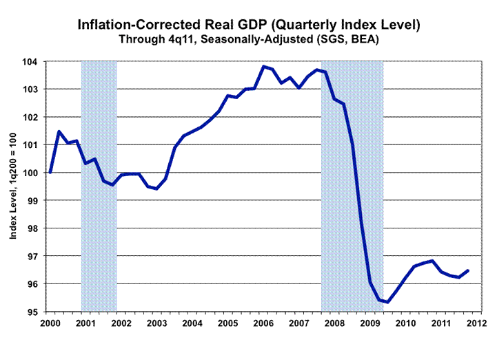 GDP Revisions and Initial GDP and GDI Estimates for Fourth-Quarter 2011. While the second revision to fourth-quarter 2011 GDP was minimal and no more than statistical noise, the initial reporting of fourth-quarter gross national product (GNP) and gross domestic income (GDI) offered sharply varying growth rates. Against 3.0% annualized real growth reported for the GDP, GNP growth was 1.8%, while the GDI surged by 4.4%. The GNP number may reflect a shift to a more-normal pattern for a net-debtor nation, that of a declining surplus or widening deficit in factor income (international flows in interest and dividend payments). The GDI growth, though, likely reflects underlying problems with wage and salary reporting and assumptions in third- and fourth-quarter 2011. Nonetheless, the GDP and related series remain the most-worthless and most-heavily-guessed-at of the government’s major economic reports.
