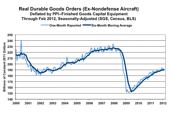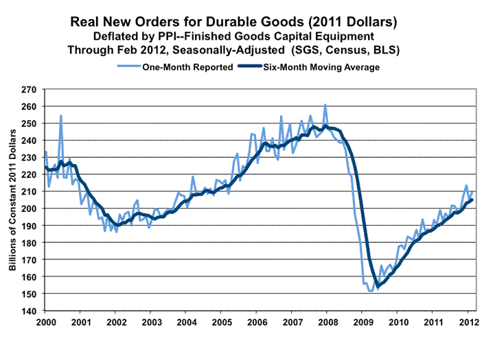 Nonetheless, the inflation measure used here is official reporting. Deflated accordingly, the real (inflation-adjusted) new orders for durable goods level in February 2012 was 9.8% below the pre-2001 recession peak, on a six-month moving-average basis. With no smoothing, the monthly level in February was 17.7% below the pre-2001 recession peak.