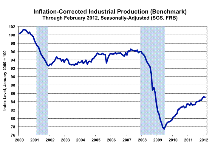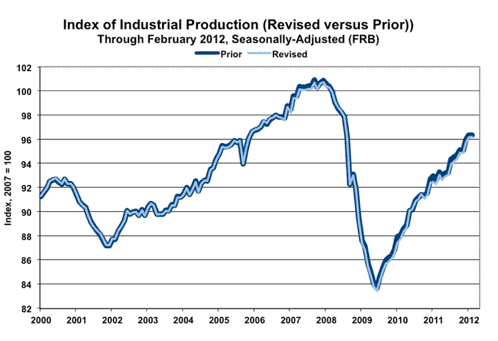 The year-to-year contraction in June 2009, at the end of second-quarter 2009, revised to a drop of 15.15% (previously down by 14.83%). It remains the steepest annual decline in production growth since the shutdown of war-time production following World War II. Year-to-year growth in February 2012 production revised to 4.24% (previously 4.03%), well off the series’ recent relative peak annual growth of 8.13% (previously 7.75%) in June 2010.