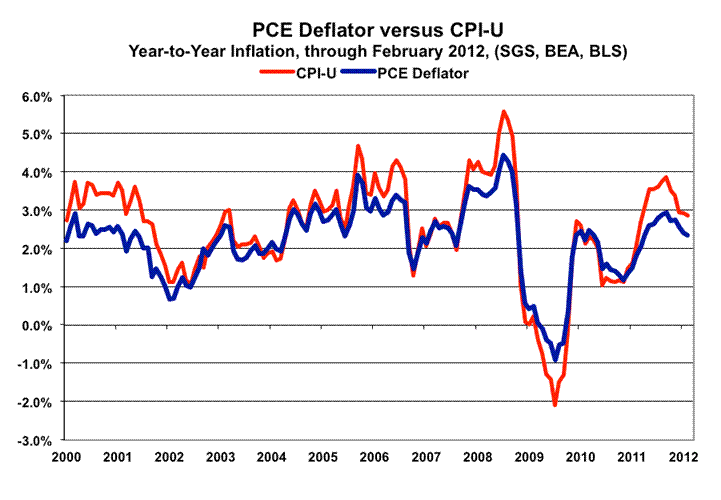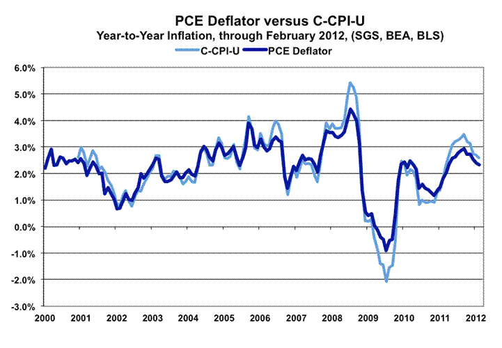 In theory the PCE deflator measure should be virtually identical to the chain-weighted-CPI (C-CPI-U) (see Commentary No. 424 for details of the latest C-CPI-U and other inflation measures). The February 2012 PCE deflator showed 2.3% inflation, versus a 2.4% year-to-year inflation rate in January; with the February C-CPI-U at 2.6%, versus a revised 2.7% (previously 2.6%) in January; the February CPI-U held at 2.9% for a second month; the February CPI-W held at 3.1% for a second month; and the February SGS-Alternate (1980-Base) held at 10.5% for a second month.