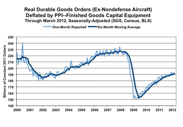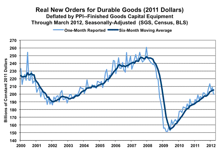 Inflation-Adjusted and Smoothed. The official 4.2% monthly contraction in March was a drop of 4.3% after inflation, and was a 0.1% gain after inflation for the six-month moving average, as of March. That was against the official February monthly gain of 1.9%, which was a gain of 1.8% after inflation, and a gain of 0.6% after inflation for the six-month moving average, as of February. These series have shown a slow uptrend in the last two-to-three years, but clearly no recovery as shown in the official GDP reporting. The real (inflation-adjusted) level of orders in March 2012 remained below the pre-2001 recession high and was 23.4% below the pre-2007 recession high.