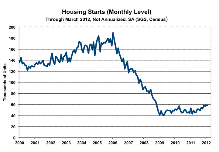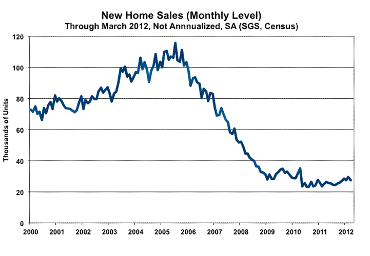 Multi-Year Crash in New Homes Sales Showed No Signs of Relief. March 2012 new home sales continued in a state of depressed stagnation, in parallel with March housing starts, as shown in the following two graphs (see Commentary No. 430 for housing starts reporting details). There remains no indication—in underlying fundamentals that drive the housing industry—of any pending industry turnaround or of a developing economic recovery.