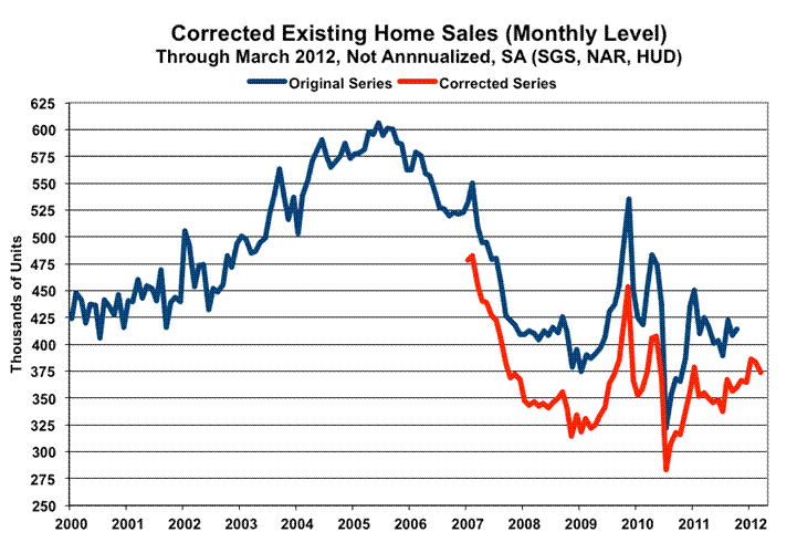 The April 19th release of March 2012 existing-home sales (counted based on actual closings, National Association of Realtors [NAR]) showed a seasonally-adjusted monthly drop of 2.6% (a decline of 2.4% before prior-period revisions). The NAR does not publish estimates of statistical significance for changes in its series. As revised, February showed a 0.6% monthly decline, which initially had been reported as a decline of 0.9%.
