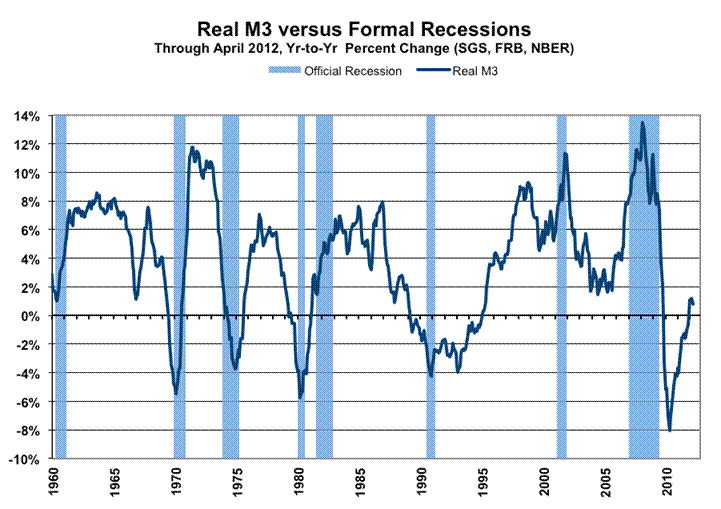 Real Money Supply M3. The signal for a double-dip or ongoing recession, based on annual contraction in the real (inflation-adjusted) broad money supply (M3), discussed in the in Hyperinflation 2012, remains in place and continues, despite real annual M3 growth having turned to the upside. Based on the April 2012 CPI-U report and the latest April SGS-Ongoing M3 Estimate, the annual growth in real M3 for April 2012 slowed to 0.8%, versus a revised 1.1% (previously 1.0%) gain estimated for March. As with the nominal M3 series, the pick-up in annual growth appears to have stalled.