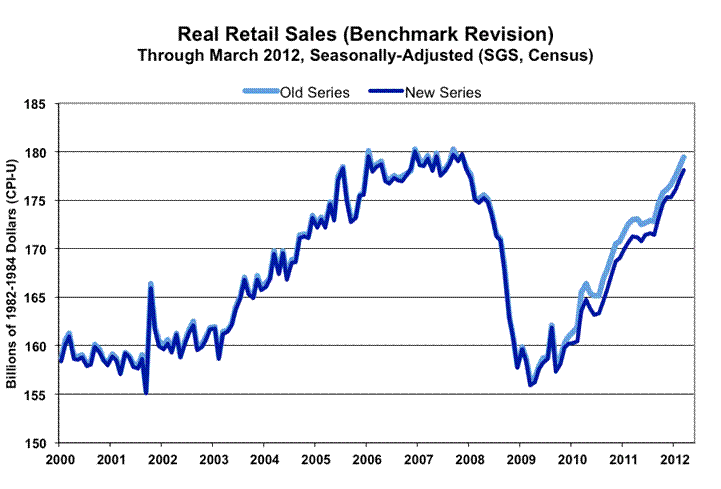 Benchmark Revision. The annual benchmark revision to retail sales was published on April 30th, showing a downside restatement to retail sales activity of recent years. Those revisions were discussed in Commentary No. 433, and they are used as the base for the new retail data published this morning, May 15th. The following graph was published in the benchmark Commentary. It does not include updated data from the April release.