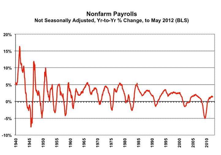 PAYROLL SURVEY DETAIL. The Bureau of Labor Statistics (BLS) reported today (June 1st) a statistically-insignificant, seasonally-adjusted May 2012 month-to-month payroll employment gain of 69,000 jobs (a gain of 20,000 before prior-period revisions) +/- 129,000 (95% confidence interval). The April payroll gain was revised to 77,000 (previously 115,000), while the March gain was revised to 143,000 (previously 154,000). In terms of year-to-year change, the unadjusted May 2012 annual growth was 1.39%, versus a revised 1.29% (previously 1.32%) in April, and versus an unrevised 1.55% in March.