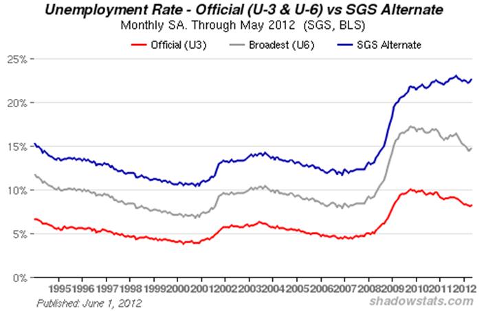 HOUSEHOLD SURVEY DETAILS. The once statistically-sounder household survey, which counts the number of people with jobs, as opposed to the payroll survey that counts the number of jobs (including multiple job holders more than once) showed a monthly employment gain in May 2012 of 422,000, following a decline of 169,000 in April, and 31,000 decline in March. Yet, the headline unemployment rate rose, as the number of unemployed increased even faster, up 1.8% for the month, versus the 0.3% monthly gain in employment.