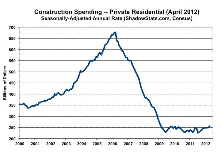 Trend of Low-Level Stagnation Continued with April Construction Numbers. The latest construction activity remained heavily impaired, bouncing along at levels near current cycle lows. The Census Bureau reported today, June 1st, that the total value of construction put in place in the United States during April 2012 was $820.7 billion, on a seasonally-adjusted—but not inflation-adjusted—annual-rate basis. That estimate was up by a statistically-insignificant 0.3% (up by 1.6%, net of prior-period revisions) +/- 1.5% (all confidence intervals are at a 95% level) from an upwardly revised $818.1 billion (previously $808.1) in March. In turn, March showed a revised 0.3% (previously 0.1%) gain versus February.