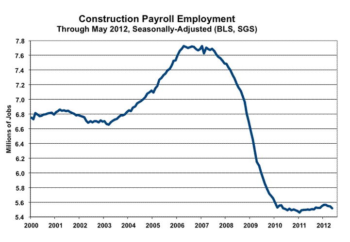 As shown in the preceding graph, in line with the ongoing bottom-bouncing reported through April 2012 in construction spending, and suggestive of that pattern having continued or deteriorated in May, seasonally-adjusted May construction employment turned to the downside. May construction jobs purportedly declined by 28,000 (down by 42,000 before prior-period revisions) for the month, to a level of 5.516 million, from a revised 5.544 (previously 5.558) million in April, per the May payroll survey.