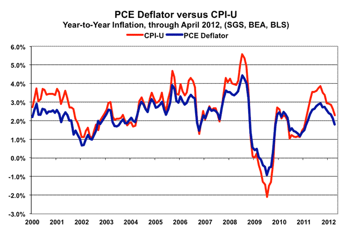 In theory the PCE deflator measure should be virtually identical to the chain-weighted-CPI (C-CPI-U) (see Commentary No. 437 for details of the latest C-CPI-U and other inflation measures). The April 2012 PCE deflator showed 1.8% year-to-year inflation, versus 2.1% in March; such compared with annual inflation in the April C-CPI-U at 2.1%, versus 2.4% in March; April CPI-U at 2.3%, versus 2.7% in March; April CPI-W at 2.4%, versus 2.9% in March; and the April SGS-Alternate (1980-Base) at 9.9%, versus 10.3% in March. Reported annual PCE-deflator inflation is shown in the following graphs against the C-CPI-U and the CPI-U
