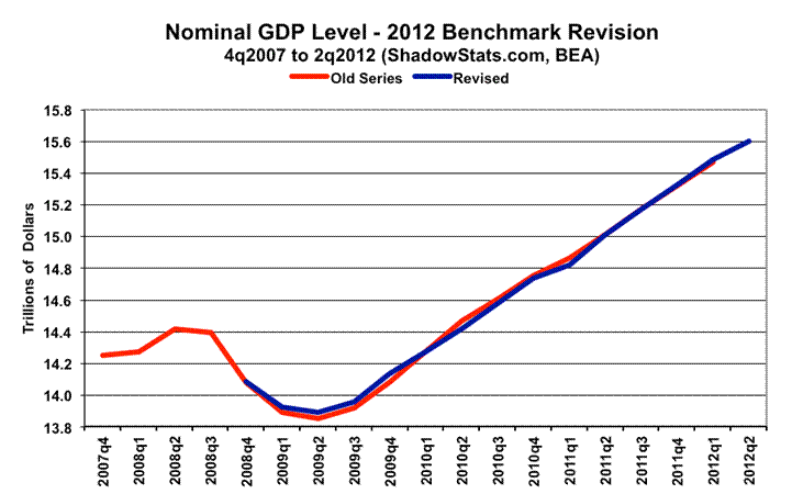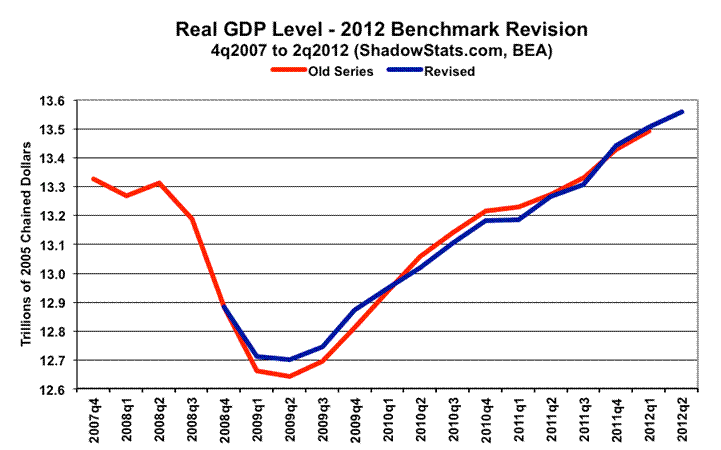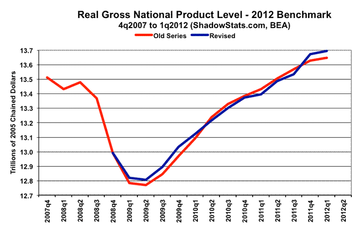 Revised official GDP reporting still shows plunging economic activity from fourth-quarter 2007 to second-quarter 2009 (the 2012 annual revisions did not pre-date first-quarter 2009), with an ensuing upturn in activity that led to a full recovery as of fourth-quarter 2011 (revised from the previously estimated third-quarter 2011 full recovery), and that recovery has continued through initial second-quarter 2012 reporting.