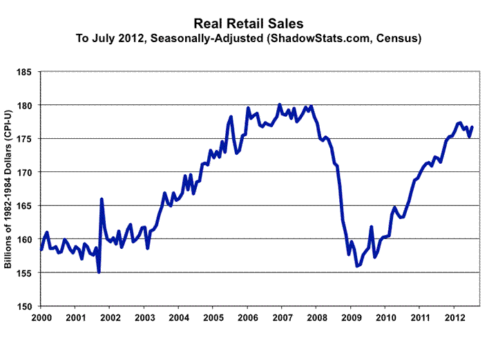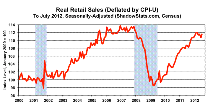 Real (Inflation-Adjusted) Retail Sales. The real monthly gain in July retail sales was shy of recovering the revised estimate of the sales volume lost in June, despite the July gain being enhanced by downside prior-period revisions and unstable patterns in the concurrent seasonal adjustment process. Based on July CPI-U reporting, inflation- and seasonally-adjusted July 2012 retail sales rose by 0.76% for the month, where, before inflation-adjustment (nominal basis), the current number was up by 0.81% (see Commentary No. 463 for detail of the July retail sales report). June real retail sales were revised to a 0.77% (previously 0.52%) monthly decline, where the nominal monthly change in June was revised to a 0.73% (previously a 0.48%) decline.