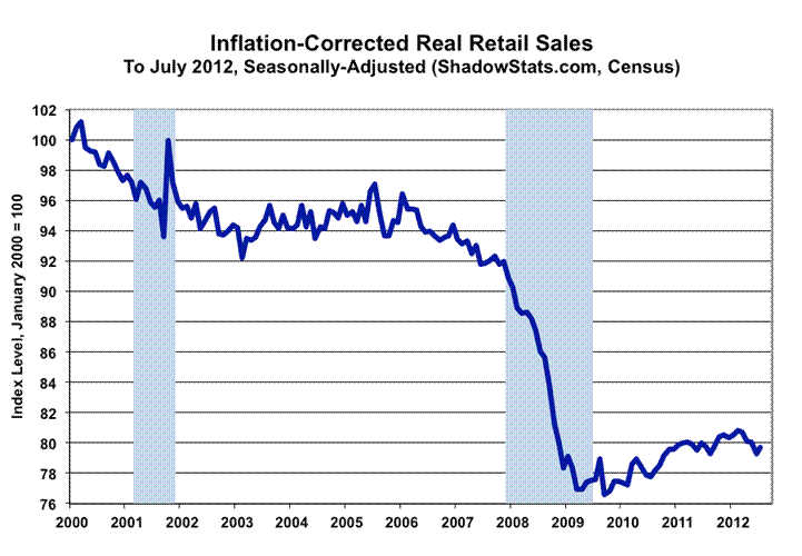 Real Retail Sales. Adjusted for inflation, the gain in July retail sales was shy of recovering the revised estimate of the sales volume lost in June. Based on July CPI-U reporting, inflation- and seasonally-adjusted July 2012 retail sales rose by 0.76%, versus a revised 0.77% (previously 0.52%) monthly decline in June. The seasonally-adjusted, annualized quarter-to-quarter change in real retail sales for second-quarter 2012 revised to a contraction of 1.73% from a 1.52% decline, suggestive of downside pressure on the upcoming GDP revision.