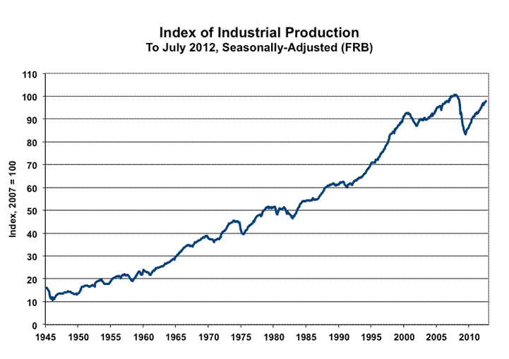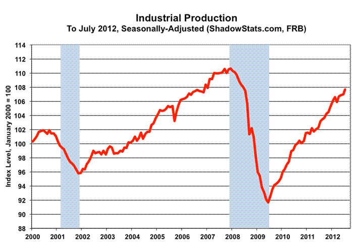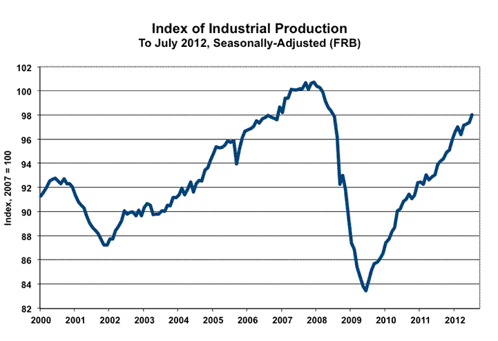Industrial Production. The headline July production gain was 0.65%, versus 0.13% (previously 0.43%) in June. The July gain largely was accounted for by excess inventory building in the auto industry. Year-to-year growth for July 2012 production was 4.37%, versus a 4.66% (previously 4.68%) gain in June.