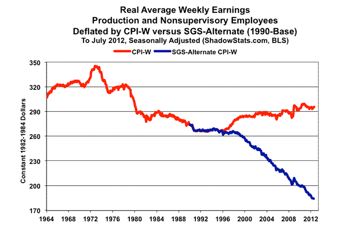 Real Earnings. Coincident with today’s (August 15th) CPI releases for July 2012, the BLS published real (inflation-adjusted) average weekly earnings for July 2012.