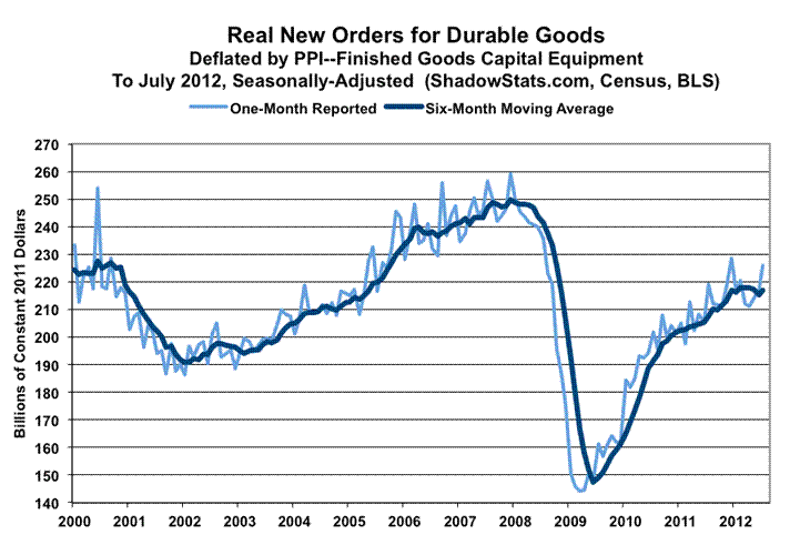As indicated in the graphs in the Opening Comments and Executive Summary, these series have shown a slowing uptrend in the last two-to-three years—now a flattening-to-down pattern—clearly not the recovery that is seen in official GDP reporting. As discussed above, the real (inflation-adjusted) level of orders in June 2012 remained below both the pre-2001 and pre-2007 recession highs.